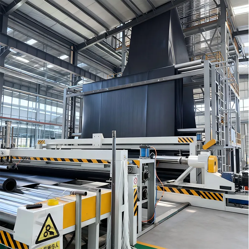 This blown film extrusion line is designed for producing wide-width waterproof geomembranes and construction protection films. It is mainly used for manufacturing three-layer composite geomembranes and waterproof liners, and with optional auxiliary equipment, it can also produce textured geomembranes, achieving true multi-function capability with one machine.